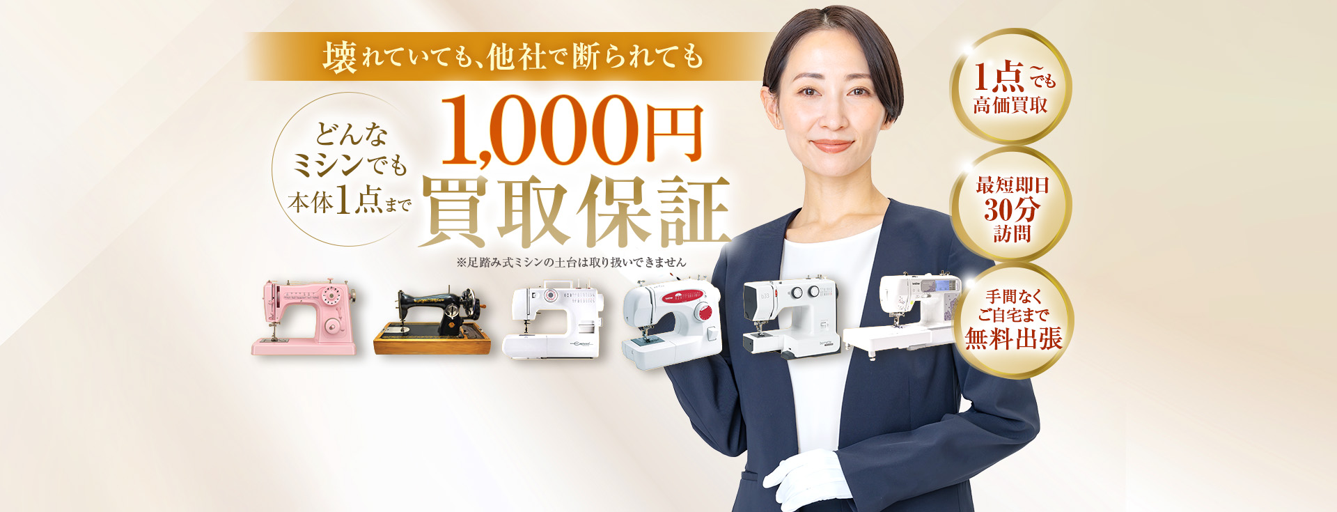 古いアンティークミシンをどう処分しようか迷っていたところ、こちらで“どんなミシンでも1,000円保証”と聞いて一安心。すぐに来てくださり、壊れていても快く査定していただき、現金で受け取れて本当に助かりました。